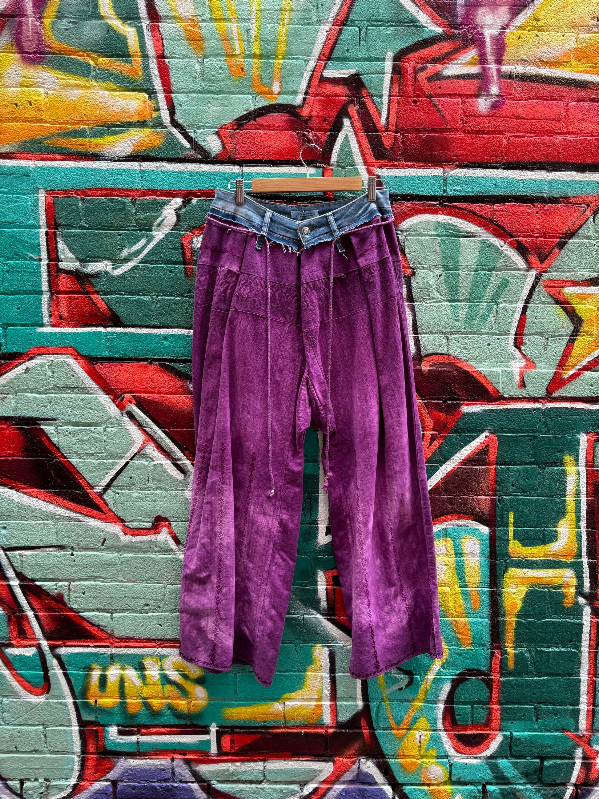 denim waistband with belt buckles. Purple dyed drawstring.