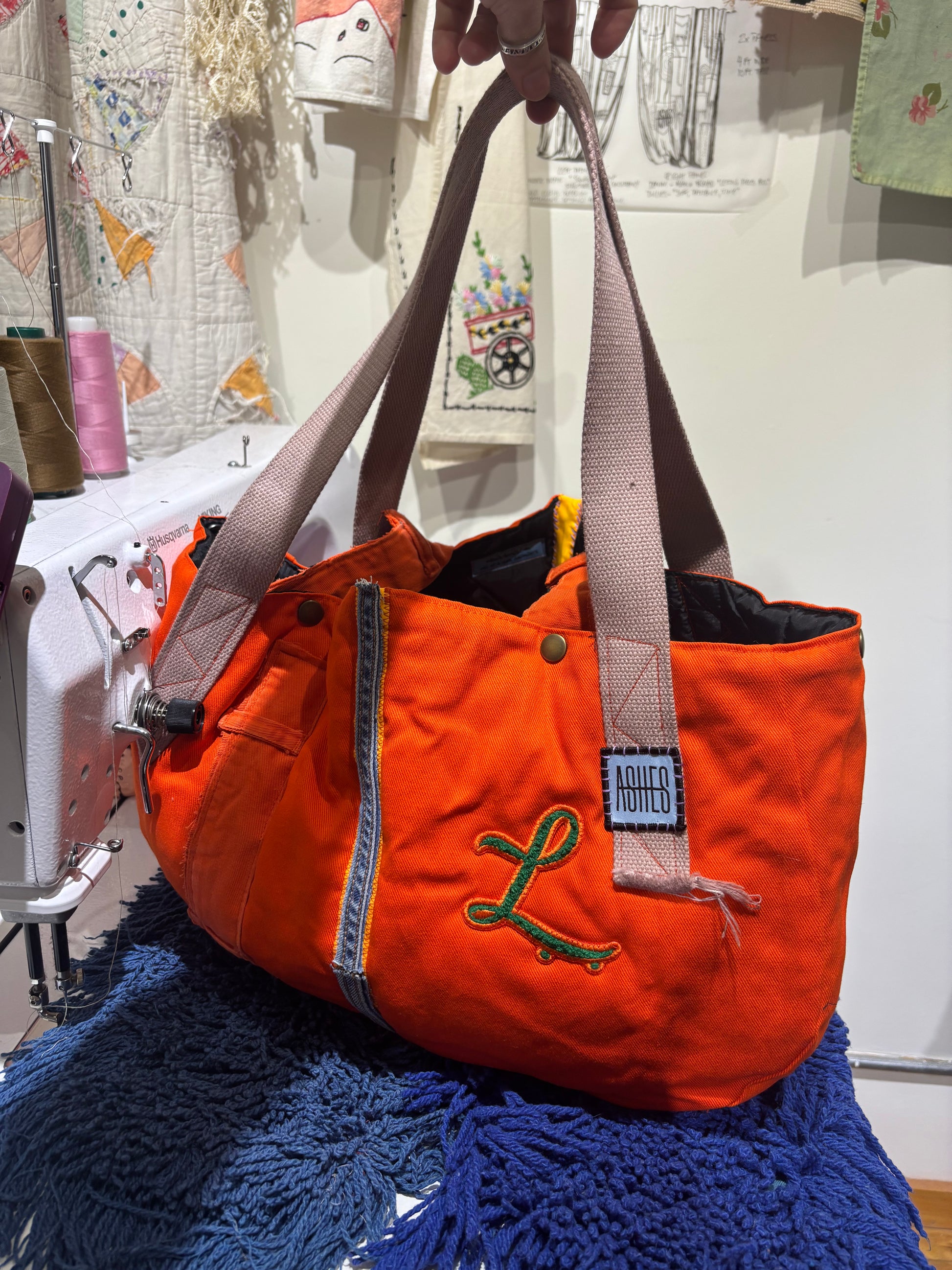 Made from the hoods of hunting jackets. Upcycled into a spacious tote bag with two snap closures at top. Cotton straps along with denim detailing. Local chenille patch and ASHES patch. Hand stitching throughout.