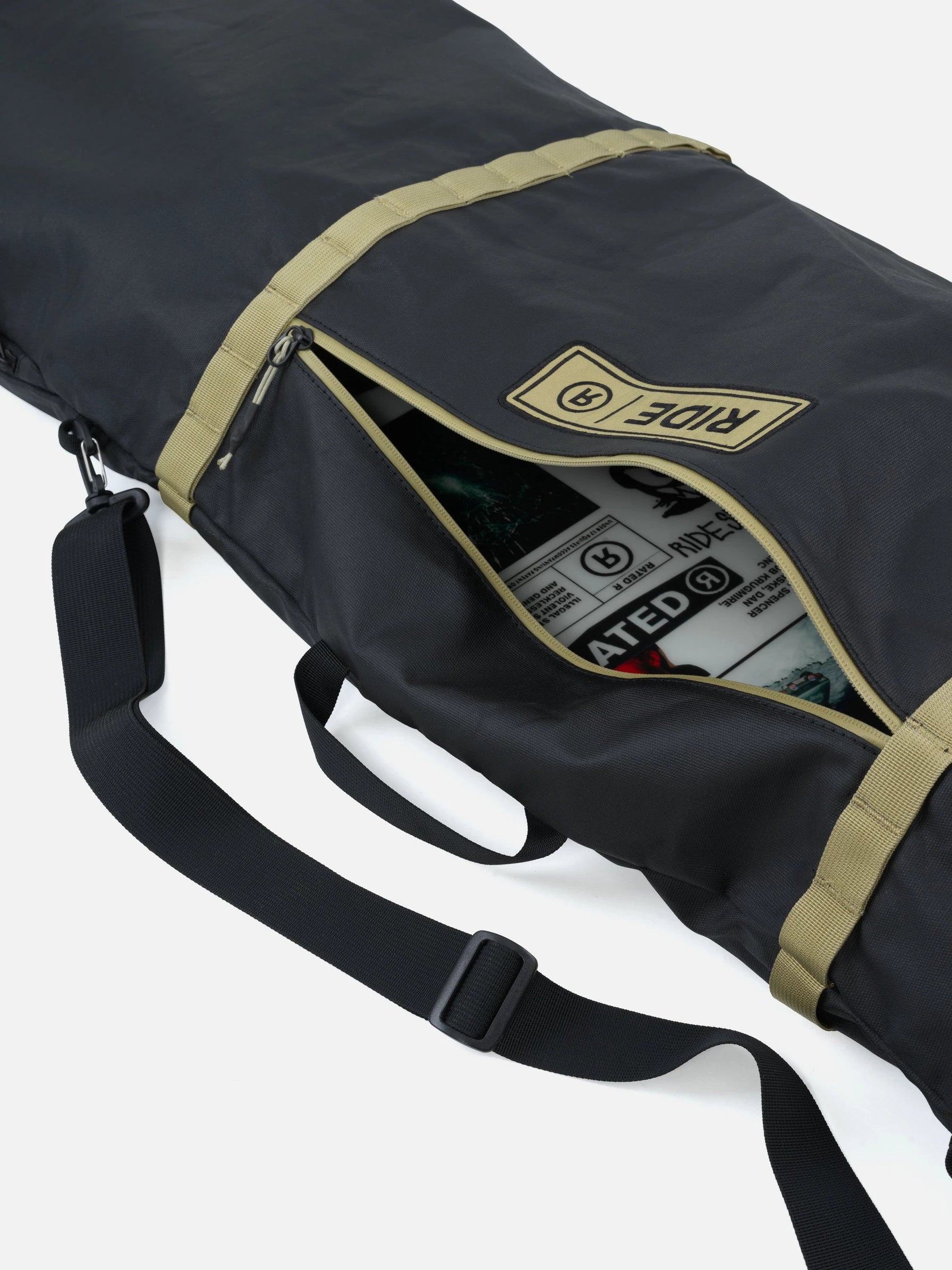 Adjustable to fit all size Ride boards with bindings and room for boots, lays/folds flat for storage.